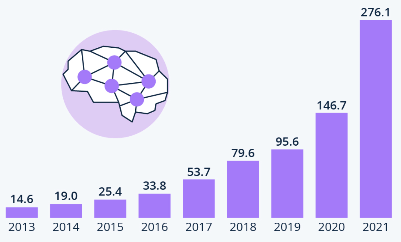 Dá uma olhada nesse gráfico abaixo, ele mostra o quanto empresas ao redor do mundo (principalmente nos Estados Unidos) investiram anualmente em IA.